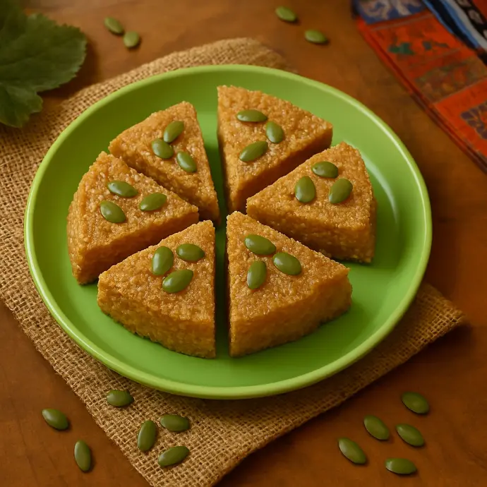 Suave budín de calabaza artesanal, coronado con vibrantes pepitas. Una combinación perfecta de textura y sabor natural. ¡Frescura en cada bocado!
